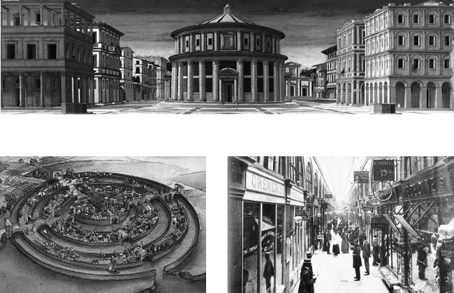 Siamo di fronte, nel primo caso, a una città costruita “a misura d’uomo”, ma del tutto disabitata, i cui confini sembrerebbero quelli di una sorta di utopia platonica: la città eterna di un uomo classico, di un ideale umanistico. Questo spazio può costituire la premessa dell’intero discorso: non solo viene considerato quasi il “manifesto” di una rappresentazione spaziale tipicamente “moderna”, cioè quella connessa alla prospettiva, ma può essere anche ritenuta un’allegoria della rappresentazione stessa così come la modernità, sino a giungere a Kant e qui teorizzandone pienamente il senso, l’ha determinata. Infatti la città ideale, chiunque l’abbia dipinta, all’interno di un contesto non lontano da Alberti e da Piero della Francesca, è quasi con certezza una “scena”: la scena di una nuova commedia, destinata a uno spettatore che apre una finestra su un mondo costruito dall’uomo, dove l’uomo stesso è protagonista assoluto e si pone – invisibile – dalla parte di chi costruisce.