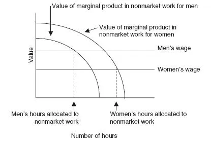It follows that if men face a higher market wage than women, as illustrated in Figure 1.2, they allocate more time to wage employment, and if their marginal product in nonmarket production is lower than that of women, they will specialize even further. In terms of the possibilities pictured on the graph, men’s decisions are efficient. Whether they are efficient (or fair) from a larger point of view depends largely on the factors determining the shapes and the shifts of these curves. What if, for instance, men earn higher wages because of discrimination against women, or are less competent in nonmarket production because they are never instructed in what are considered “feminine” skills? An answer to the larger efficiency question requires exploration of counterfactual possibilities that are not in the picture.