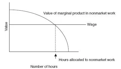 To illustrate the more specific mechanics of his approach, consider an individual who has a choice between specializing in producing goods and services for their own consumption (whether on a family farm or in the home) or working for a wage. The wage is determined by the forces of supply and demand in the labor market, and remains the same no matter how many hours of work are supplied to the market. However, the marginal product of labor devoted to nonmarket work is likely to decline after a certain point, simply because of diminishing returns to labor given a fixed supply of capital and other inputs.