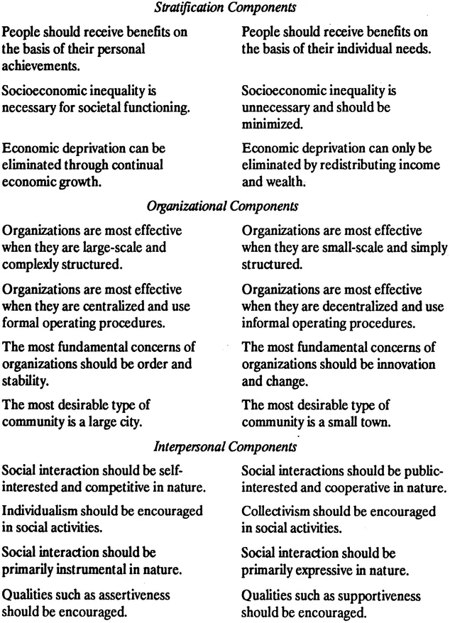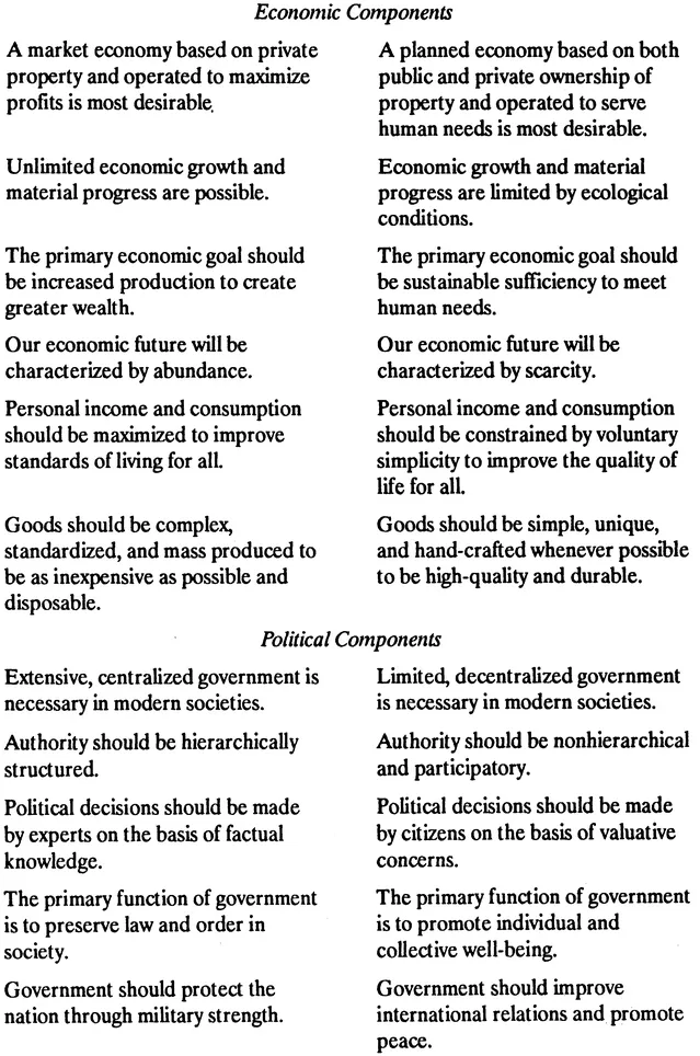 Figure 1.1 lists various components of the old Industrial Worldview in the left-hand column, and corresponding components of the new PostIndustrial Worldview in the right-hand column. These components are arranged under several topical headings, but all of them are commonly viewed as constituting a single, comprehensive conception of human social life.