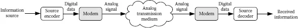 As can be seen from Figure 1.3, when the source (e.g., a computer) generates a digital stream of data and the transmission medium is analog, a modem (modulator and demodulator) is used to perform the required conversion. The modulator converts digital data into analog signals, whereas the demodulator (at the receiver) converts analog signals into digital data. An example of an analog transmission medium is radio transmission, whose signals consist of electromagnetic waves (presenting a continuous variation in time).