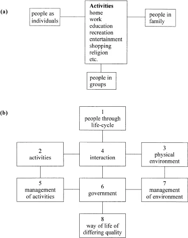 The activities take place within the framework of Figure 1.1a,b. There is a flow of people to their activities, from within the town and surrounding area, who use the physical stock as producers and consumers: for part of the time they live in their dwellings (homes, hotels, etc.) and for part of the time occupy the buildings and places designed for social activities (work, recreation, leisure, education, etc.). As linkages between the activities there are the means of transportation and communication.