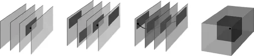 Figure 1.2 A visual comparison of different local features used in the context of CBCD. In the first three drawings, a 2D feature is detected at a specific (key)frame. The descriptor is computed (from left to right) using solely spatial information; by adding temporal information by including information from neighbor...