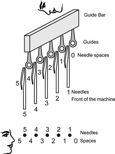 Each warp yarn, used for production of warp knitted fabrics, is formed from a single guide. Several guides are grouped into guide bar, as shown in Figure 1.1. Each guide bar moves around the needles and places the yarn over, between and after or behind these during the production process. The needles, the spaces between them and the guides are numbered, starting from the side, where their pattern drive (cam, chain links, electronic drive) is mounted. Usually, the pattern drive is placed on the right hand side of the machine and the needles, and the guides are numbered from right to the left. For the graphical notation of the warp knitted structures, the complete motion process of the guides is recorded symbolically on paper. For this notation, the person has to assume, that is looking at the needles from the top (Figure 1.1 upper picture), but for simplification, only the needle cross section is drawn as a thick point. For each knitting cycle, one row with points and spaces between these is used.