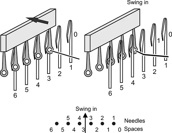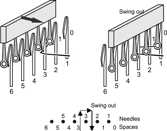 The new placed yarn piece in this case remains in the needle hook and the previous loop can knock over it. After that, the needle bar moves up and the cycles start again. For each such cycle, the numbers of the swing-in and swing-out positions are notated, separated by m...
