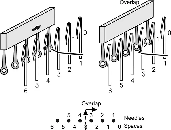 After the placing the yarn(s) between the needles the guide bar is moving to left or right in the front of the needles, placing yarn over them - overlapping (Figure 1.3). The overlapping is a shog over one or seldom over two needles. The limitation to one or two needles is based on the need of the yarn length for the loop building process. If yarn is placed over more than two needles, during building of the loops there will be not enough yarn length for more loop heads, legs and underlaps and the yarn will break. In pattern drawing this step is drawn as a small arrow or arc over the point. If no loop has to be built, then the guide bar stays there and does not perform any motion during this step.