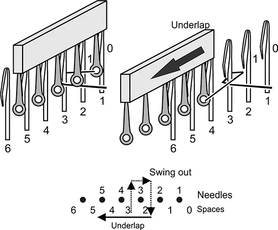 Finally, the guide bar moves behind the needles and the guides place their yarns “under” the needles (Figure 1.5). The motion is named underlap. This motion is not limited to one or two needles, because the yarn does not have to build loops on this side, and the required yarn length has to be taken from the beam. The limitation of the underlap motion is determined from the patterning device - it can be often not more than 32 gaps.
