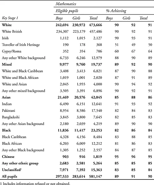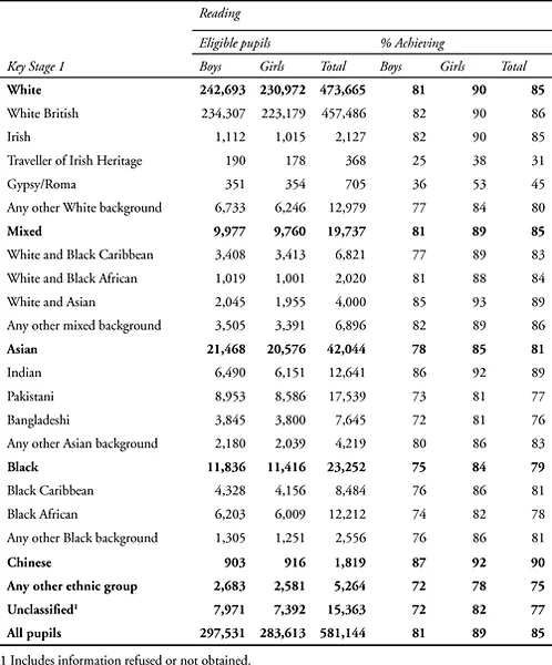 Table 1.1 Achievements at Key Stage 1 Level 2 and above in 2004, by ethnicity and gender