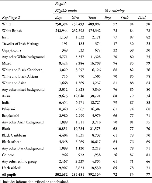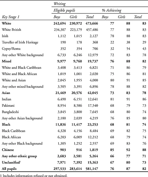 The following tables are drawn from the Department for Education and Skills (DfES) website, and depict pupils’ achievement at Key Stages 1–4, according to ethnicity and gender. They provide a vivid illustration of current attainment patterns, and our commentary attempts to draw out some of the complexities that the figures reflect, as well as key points of note. What needs to be kept in mind when looking at the percentage figures is that some groups are far bigger than others (e.g. 473,665 ‘White’ pupils eligible at Key Stage 1, compared to 42,044 ‘Asian’, and 1,819 Chinese). We can also see in each case how the ‘Total’ (bold) figure is relatively useless (or misleading), given that the group categories are so broad as to include groups with vastly differing performance levels (e.g. White British and Gypsy/Roma under the title ‘White’; or Indian and Bangladeshi pupils under the title ‘Asian’).