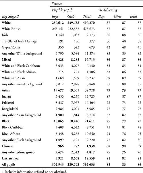 Although social class continues to have a profound effect on school achievement, in our contemporary society it is increasingly difficult to define and categorise (see Chapter 2). This is especially the case for minority ethnic groups, whose trajectories and experiences often defy traditional British categories of social class as delineated by the Registrar General Scale (Archer and Francis, 2006). Categorisation of ‘poverty’ by the uptake of free school meals (FSM), as utilised by the DfES, may be particularly problematic for any analysis of ethnicity issues, as some groups may be more likely than others to draw on state services such as free school meals. For example, a propensity has been noted by some commentators that some Chinese families may try to avoid reliance on the state, and indeed lack awareness of what benefits may be on offer (Chau and Yu, 2001). Such examples may, of course, apply equally to other minority ethnic groups. However, for the purposes of providing a rough indicator of relative poverty, the delineator of FSM serves a basic function. Indeed, Table 1.4 vividly illustrates how social class/soci...