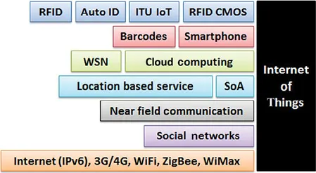 Translating the IoT concept into the real world requires integration of several enabling technologies. Technologies that enable IoT are shown in Figure 1.2 [4]. These IoT technologies are widely used for the deployment of successful IoT-based products and services. These include RFID, wireless sensor networks (WSN), middleware, cloud computing, artificial intelligence, IoT application software, and Micro-Electro-Mechanical Systems (MEMS) [5, 6 and 7].