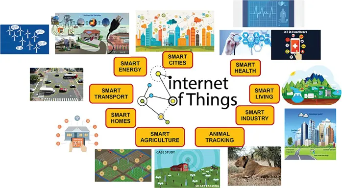 The main advantage of the IoT concept is the high impact it will have on various aspects of everyday-life of potential users. The US government and government of other nations such as UK, China, and India are taking drastic measures to incorporate IoT into many industries. This action will have impact on various government projects such as smart cities, smart manufacturing (SM), smart materials, smart transportation, smart power grids, smart agriculture, etc. The IoT is applied in health care, automotive industries, smart power grid, manufacturing, transportation, agriculture, logistics, pharmaceutics, surveillance, etc. Some of these applications are illustrated in Figure 1.3 [10]. Here we will consider some typical applications of IoT [11,12].