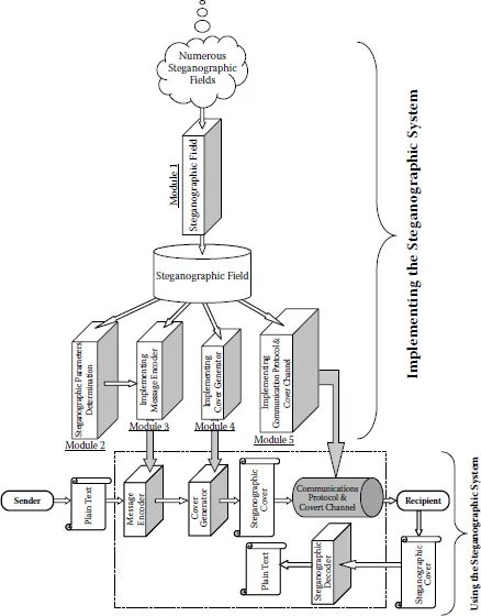 Nostega achieves legitimacy by basing the camouflage of both a message and its transmittal on a particular field such as education, economics, graphs, or games, as stated earlier, in the above example of Bob and Alice, using a particular profession or relationship gives legitimacy for camouflaging both a message and its transmittal. The core idea of the Nostega paradigm is basically camouflaging messages by embedding them in a form of noiseless data by employing either altered authenticated data or legitimate untraceable data, as shown in Section 1.3. The following is an overview of the Nostega architecture, which consists of five modules as shown in Figure 1.1.