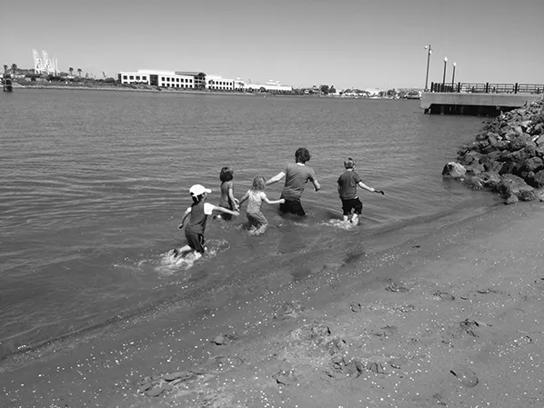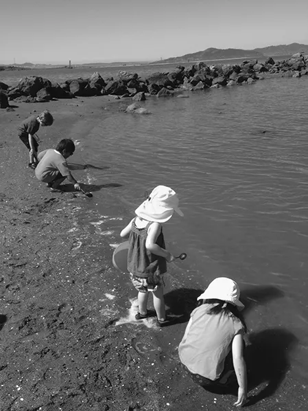 Twelve children, ages 18 months to five years, pile out of a van. They walk right past a brightly colored play structure. What has caught their attention enough to make the built playground unappealing? A few of the older children begin to point past the structure, and the younger ones follow their lead. It is geese, pecking at the ground and wandering through the patch of grass next to the structure. The children giggle as some begin to walk like geese, and Diana, their teacher, points out their long, graceful necks. “So they can reach down and get their food,” says four-year-old Stephen (names of children have been changed). Two children bend their heads down, as though looking for the food. No one chases the animals. The group continues on, picking up the pace as they sense that water is near. They begin running as the small stretch of beach comes into view. The beach looks out over both a sailboat marina and the remnants of an industrial shipyard. This is urban nature. Sand, bay, crabs, birds, and also pavement, cranes, and oil storage tanks in the distance. And yet the children are as focused on the natural world as if they were 100 miles away from the nearest road.There is an ebb and flow of energy from group interactions to individual explorations and back to the group. One child finds tiny crabs in the water, and soon a small crowd gathers. Joshua, age five, grabs a large shovel and uses it to gently scoop the water, trying to catch a crab. Soon five children are testing different methods, including two-year-old Stella, who cups her hands together, scooping water and saying “crab,” but staying well out of reach of the actual animals.Teacher Diana spots a dead stingray that has washed ashore, and the energy shifts to a teacher-mediated discussion of dead creatures. The children ask where it lived when it was alive, and if it can still sting. The teacher wonders with them. But Jacob, age four, has persisted with the crab hunt, and he arrives at the stingray group announcing, “I got a crab!” He repeats this twice, and suddenly the group energy shifts back to the crabs, first gathered around Jacob’s bucket, admiring, and then back to the water as each child grabs a pail and imitates his technique. As children begin to collect the crabs successfully, many of them break from the group and focus only on the tiny living creatures in their buckets.Juliet, my own four year old, seems to notice me for the first time since arriving, and she shows me the crab in her bucket and explains, “Mama, I’m testing to see if it’s alive or dead. I tried putting a stick down there and it didn’t pinch, so I’m thinking dead.” Her friend Ariana comes over with her own crab in a bucket, and they begin to play a version of house with the crabs. “We need to take care of them so they won’t be dead,” says Ariana. “They need a blanket.” She begins to cover her crab with sand. “No no, they’re for real living, Ariana,” Juliet responds, looking worried. “They need healthy food,” says Ariana, and an argument is averted as they begin looking together for something to feed the crab “babies.”