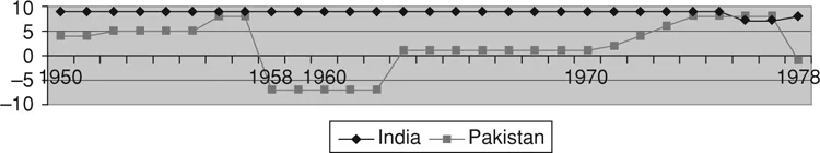 Conventional accounts, however, accept that there is a genuine and persisting regime difference between the two countries. Consider the graph we can generate from the Polity IV data for the first three decades of independence, and then the graphs of Freedom House data (Figures 1.1–3).