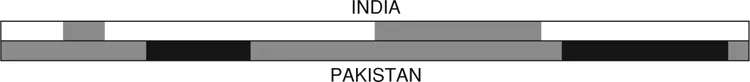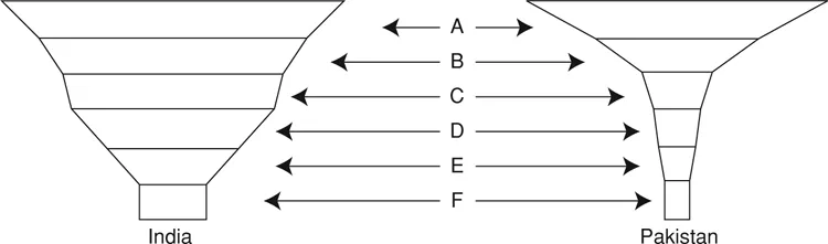 Some help in evaluating where India and Pakistan fit using these criteria is to be found in the State of Democracy in South Asia report (see also a summary article, deSouza et al. 2008). This report is based mainly on a very careful and convincing opinion survey, conducted in the five major countries of South Asia in 2004. The graph that depicts the “funnel of support for democracy in South Asia” (SDSA 2008: 13) shows a “stage one” bar indicating the percentage of respondents who support government by elected leaders. For India the figure is 95, and for Pakistan 83 (Figure 1.4). The “funnel” – perhaps “inverted pyramid” would be a better description – is then drawn by cutting away the base of that possibly superficial support for democracy, by showing five more bars underneath, each of which represents the bar above minus the respondents who have answered questions in a way that negates their support of democracy.