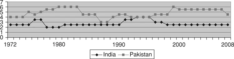 Freedom House labels India “free” from 1972 to 1974, from 1977 to 1989, and from 1998 to 2007 (and “partly free” in 1975–6, and from 1990 to 1997). Pakistan is judged to be “partly free” from 1972 to 1978 and from 1984 to 1998, and “not free” from 1979 to 1983 and from 1999 to 2007. Pakistan returned to “partly free” status in 2008 (see Figure 1.2). Alternately, the Freedom House data can be graphed to show the average “political rights”/ “civil liberties” score, where “1” represents the highest degree of freedom, and “7” the lowest (see Figure 1.3).2