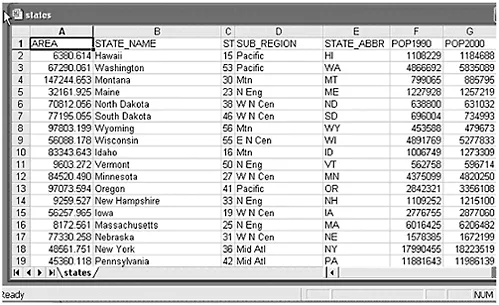 Why would we want to do this? First, once we have the ability to locate a subject in physical space, we can create maps of our survey data. Maps are often a powerful way of displaying data in an interesting and compelling wayâmuch more so that a dry and boring table. Figure 1.1 is a display of some data for each state in the United States; among the data shown here is the membership in the U.S. Census Bureauâs sub-region classification system for each state, given in Column D.