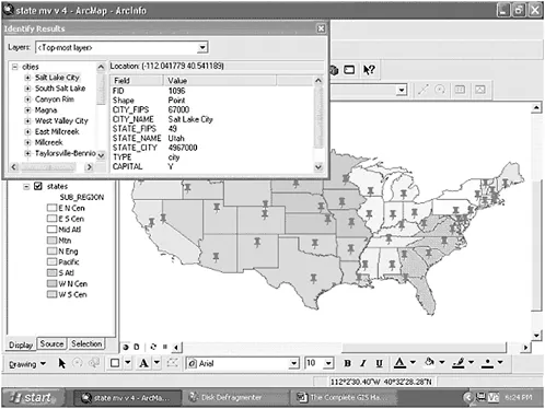 Among the information displayed in the drop down box labeled Identify Results is the longitude and latitude of Salt Lake City. Notice also at the bottom right of the screen another latitude and longitude is displayed; if you move the cursor around on a map, this line will display for you the longitude and latitude of wherever the cursor is pointing.
