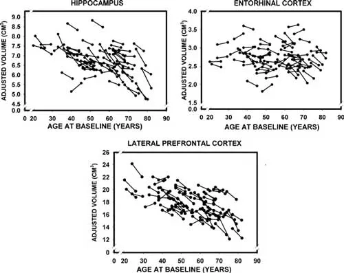 Fig. 1.1. Longitudinal changes in adjusted volumes of the hippocampus, entorhinal cortex, and lateral prefrontal cortex as a function of baseline age. Reproduced by permission of Oxford University Press from Raz et al. (2005). Regional brain changes in aging healthy adults: General trends, individual differences and modifiers. Cerebral Cortex, 15(11), 1676– 1689.