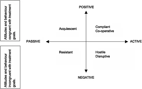 This framework allows attitudes and behaviours to be perceived and categorised differently by clients and clinicians. This is a dynamic process, influenced by client beliefs, goals, external constraints and experience of services. These in turn are influenced by clinicians, settings, and social and cultural factors. A relationship that is positive and collaborative is seen as the best way of managing these complex influences. The way in which individuals view