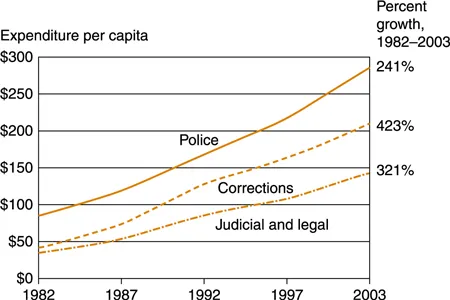- What does all of that cost? Well over $60 billion annually,2 which is on a par with the national budget of Austria, Taiwan, or Poland.3 As indicated in Exhibit 1.1, corrections has been receiving a steadily increasing share of total criminal justice resources. In fact, its rate of growth from 1982 to 2003 (423 percent) outpaced both police and the courts. As a result, the correctional conglomerate has been consuming an increasing share of tax dollarsâfar outpacing the growth of other public services in many states. Second only to Medicaid, corrections has become the fastest-growing general fund expenditure in the U.S.4 Between 1987 and 2007, for example, total state expenditures on corrections more than doubled.5 In fact, one state recently made deep cuts in the budget for such essential services as mental health and education, while at the same time funding an extra $6 million for its prisons.6 Experts have been expressing concern that this spending pattern may continue until it hits âcritical massââthe point at which there may be few resources available for anything else.7