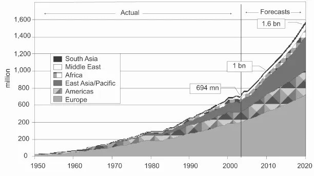 Tourism has grown immensely over the past 60 years. From 1950 to 2005, international arrivals have grown by 6.5 per cent per year, i.e. from an estimated 25 million in 2050 to 806 million in 2005 (Figure 1.1; UN World Tourism Organization (UNWTO) 2001, 2010a). In the following three years to 2008, international arrivals increased by more than 100 million to 920 million. By then, however, the global financial crisis set a stop to the strong growth trend, and arrivals declined by 4 per cent in 2009 to 880 million (estimate, UNWTO 2010b). However, UNWTO (2010b) projects that the world economic system will stabilize and that growth will resume at 3â4 per cent in international tourist arrivals in 2010 to reach 1.6 billion in 2020 (UNWTO 2001).