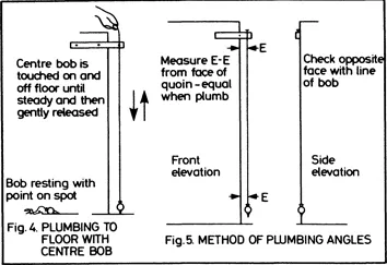 THE PLUMB BOB: This is always positive. Using a fine line minimises the effect of the wind. A line may be plumbed single handed on to the floor (Fig. 4), a quoin may be checked both ways by a combination of sighting and measuring (Fig. 5).