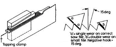 1. Top off the teeth using a mill saw file in a topping clamp (Fig. 7) until the points of the lower teeth have been reached and the line of points follows a slight camber.