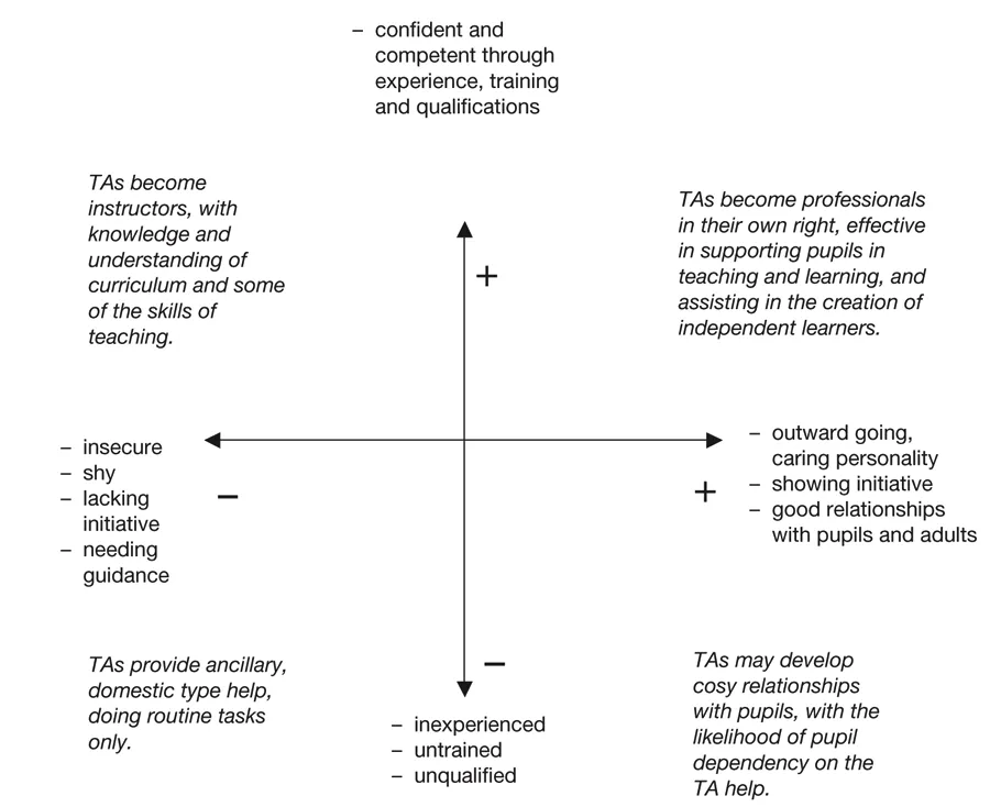TAsā development is a process during which adults who have outward-going, caring personalities, a commitment to education and are prepared to develop and undergo training of a variety of kinds can provide responsive, sensitive and knowledgeable aides to the teaching and learning process. WR was an opportunity to rethink, but it also opened up further problems for leaders and managers to deal with, such as the support that TAs need to fulfil a larger role. Also, what teachers might need to work effectively with the additional adults. The issue of dealing with yet more staff was not new.
