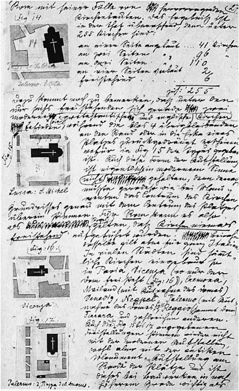 Der Städtebau goes about the exploration of the past in order to derive maxims for the present. In fact, Sitte’s book is divided in two sections: one analytic and one synthetic. In the first section, “beautiful” city structures from Western Europe and above all from Italy were carefully studied. The author obviously knew almost all of them, because they were the destinations of prolonged and repeated study trips. Sitte always proceeded with the same method: he arrived at the city, was driven from the railway station to the main square, asked for the hotel with the best restaurant, the best bookstore, and the best watchtower. He ascended the tower and from there analyzed the ground plan of the city, which he later sketched in an abridged version during dinner. In contrast, in the second section, he went on to criticize contemporary city planning methods in consideration of the “lessons of the old masters,” and he issued suggestions for their improvement.