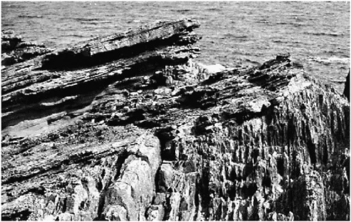 Hutton ably made his case and deeply transformed the way we understood the Earthās history. Before Hutton, the story of the Earth was the modest tale of a gradual wearing down, as the wind and elements eroded its bolder features. With Hutton, things opened up dramatically. Different parts of the Earth could be different ages, depending on the play of igneous forces. Whole mountain ranges and continents could be relatively old or young. The Rockies, for example, are only about 40 million years old; while the Appalachians are around 300 million years old. Moreover, in a given place the layers of rock may reveal a history of the rise and fall of landscapes as complicated as the rise and fall of the kings and queens of medieval Europe. This was immediately clear to Hutton and his colleagues on a trip into the field when they came to Siccar Point, which juts out into the North Sea some 30 miles east of Edinburgh. There they found two beds of sedimentary rock, each one representing a long stretch of time when this region had been below sea-level so that sediment could accumulate and compact into rock. Furthermore, the fact that the lower, older bed was vertically standing meant that it had been upended from its original horizontal lie by powerful forces long before the younger bed had been formed above. Here is a lovely photo of Siccar Point from the geology department of Lawrence University in Wisconsin.