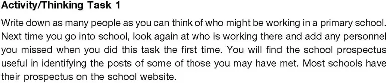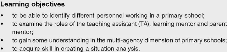 Most people, outside the primary sector, when asked this would probably start off with teachers. Then, if there remained a pregnant silence, would move on to other school-based workers such as site managers, cleaners and a secretary. When children are asked this, they generally include themselves very early on. It is as if we retain a memory of the old Victorian and Edwardian photographs of classrooms with a teacher, pupils and perhaps the odd pupil monitor. Today's schools are staffed very differently and the primary purpose, of this chapter is to help readers to identify some of the less obvious but extremely important personnel working in today's primary schools.