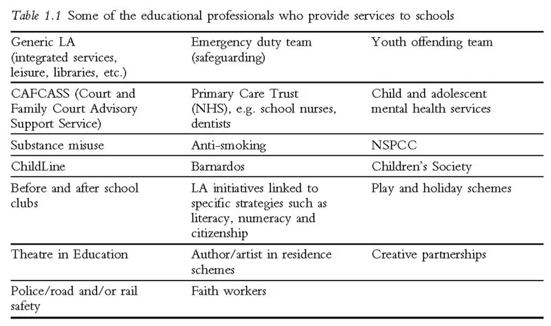 There were many other workers in school on my tour day. These include the welfare staff, who supervised the children at lunchtime and who have had several courses on outdoor play; the cook and catering staff who had been involved with courses on healthy eating and hygiene; voluntary workers; specialist support staff; professionals from other public services; professionals from charities; and once a week one of the local priests who takes an assembly in this non-denominational school. He is also a school governor. In this chapter we are concentrating on identifying those different groups whose work is directly linked to enhancing children's learning. They can be categorised into four different groups: