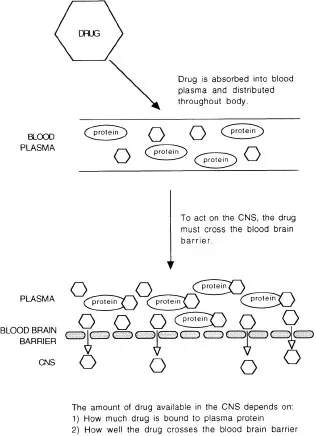 Once the drug has entered the blood plasma, it is distributed throughout the body via the systemic circulation. How much drug will be available to bind to receptors on neurons in the central nervous system (CNS) depends on how well the drug crosses the blood brain barrierāa term used to describe the low permeability of capillaries that supply the CNS with bloodāand the amount of drug that binds to blood proteins2 (and therefore cannot bind to CNS receptors; see Fig. 1.1). Some drugs that are used experimentally cannot be used clinically because they cross the blood brain barrier so poorly that they can only be administered directly into the brain. Other drugs bind extensively to blood proteins and therefore much of the drug does not cross the blood brain barrier.