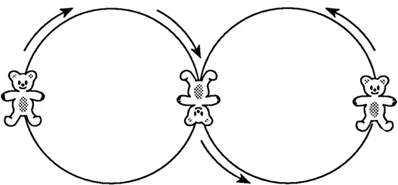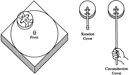 The horizontal apparatus consists of a square platform on which is drawn a large circle almost tangent to the edges (Fig. 1.1). On the platform sits a round box containing an unmovable bear lying on its back. The child is asked to indicate the bearâs head and hind legs. The box is then closed by means of lids of which there are two sorts. One is attached to a long stick that allows the box to be pushed around the circumference of the circle without changing the bearâs orientation relative to the subject (circumduction); the other has a shorter stick that attaches to a pivot in center of the circle so that, when the box is pushed around the circle, the bearâs orientation rotates from rightside-up through upside-down and back to rightside-up relative to the subject (rotation). In both cases, the investigator has the child establish the position of the head at the start, for example, toward the subject, toward the window, and so forth. Then the box is closed, and the child is asked to move the box 90°, 180°, or 270° using specific movements of the stick and to indicate the position of the bear after the movement is performed.