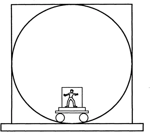 The vertical apparatus consists of a little trolley car on rails (Fig. 1.2). On it sits a wooden base holding a picture of a little man drawn on a card. The picture is masked while the investigator performs movements either of circumduction (where the man remains upright) or rotation (where the man turns upside-down at 180° and rightside-up at 360°. After each movement, the experimenter asks the subject whether the man is standing, lying down, and so on, and in what direction his head is pointing as well as to give reasons for his answers. Then the investigator takes the card out of the base, hands it to the child, and asks him, by imitating the movements, to anticipate the path to be traversed or to reproduce the path that has been traversed when the little man was behind the screen. The child also is asked to compare the two apparatuses.
