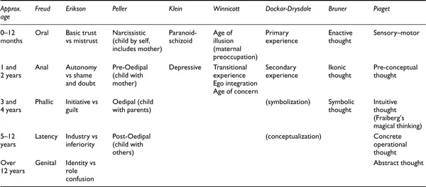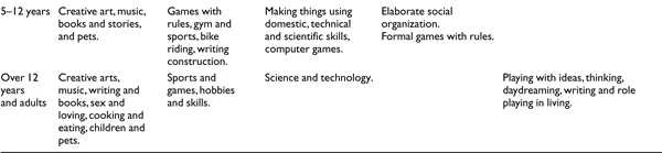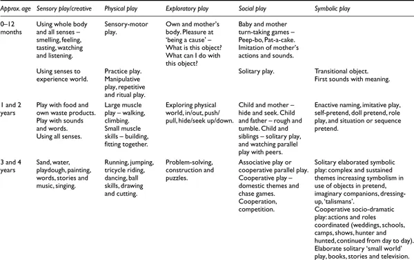 For many children such healing play takes place in the normal course of events, probably without adults being aware. The opportunity to play may be enough for the child whose life is not overwhelmingly disrupted or distressing, and when there is someone around who holds the child in mind, providing the emotional containment which helps them manage their anxiety. Children who have had too much going on in their lives can benefit from the active involvement in the play process of a concerned, aware and containing adult. This is where therapeutic play or specific play therapy sessions may help. When we are offering play help we need to think carefully about our provision and management of each of the essentials of play. How we provide them varies, depending on our assessment of the child’s needs. We will return to these questions. First, we need to understand the pattern of development of play so that we can recognize the developmental level a child has reached if we are to use play appropriately to help. The development of play is linked to aspects of physical, intellectual and, crucially, social and emotional development. Observations of spontaneous play are invaluable in diagnosis and assessment. The rest of the chapter describes children’s emotional and play development from birth to adulthood. This is summarized in Tables 1.1 and 1.2 (p. 34 and pp. 35–36).