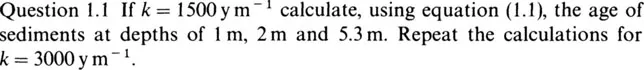 where k is a constant. In other words, the age of the sediment equals its depth multiplied by a constant. Constants are values which do not change within a given problem. In the case of the problem above, the constant tells us how rapidly sediments accumulate. A large value for k implies that age increases very rapidly as depth increases (i.e. sediments accumulated very slowly). A low value implies that the age increases more slowly (i.e. sediments accumulated more rapidly). In a particular lake it might take 1500 years for each metre of sediment to accumulate. In this case k = 1500 years per metre (ym-1). A lake with a lower sedimentation rate of, say, 3000ym-1, would have a more rapid increase in age with depth of burial.
