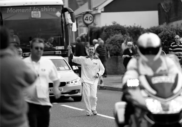 Figure 1.1 The Olympic Torch Relay of 2012 implicitly celebrated and performed ideals of active citizenship. Here the torch is carried by Howard Otton in recognition of his voluntary service with Dartmoor Search and Rescue Team, Plymouth (Photo: Mike Knapman)