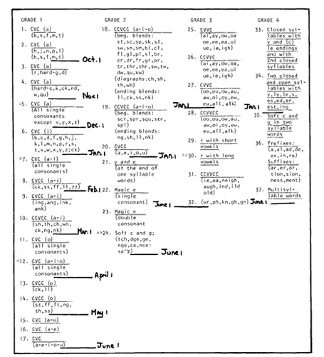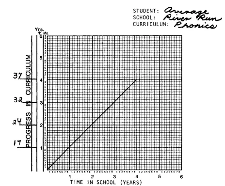 After the data are obtained, a graph is constructed. The abscissa is divided into equal time units. The ordinate displays that sequence of materials or objectives for the children according to the time in which the average student is expected to master each unit. A diagonal line is drawn, from left to right, to represent average progress through that period of time in the curriculum atissue. Figure C-2 demonstrates how average performance on phonics in one school system might be graphed, based on the scope and sequence in Figure C-l. We now have, based on this example, a picture of the expected time it takes for average pupils to progress through the four-year reading phonics curriculum.