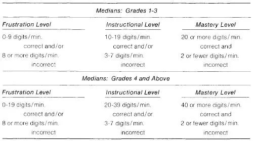 For each set of problems, the correct and incorrect number of responses are ordered from high to low, and medians constructed. It is the median measure of correct/incorrect rate per minute that represents progress in math. These median rates are then compared to criteria established for mastery, frustration, and instructional levels. While local norms probably need to be established, Table C-l presents the criteria developed in one school system.