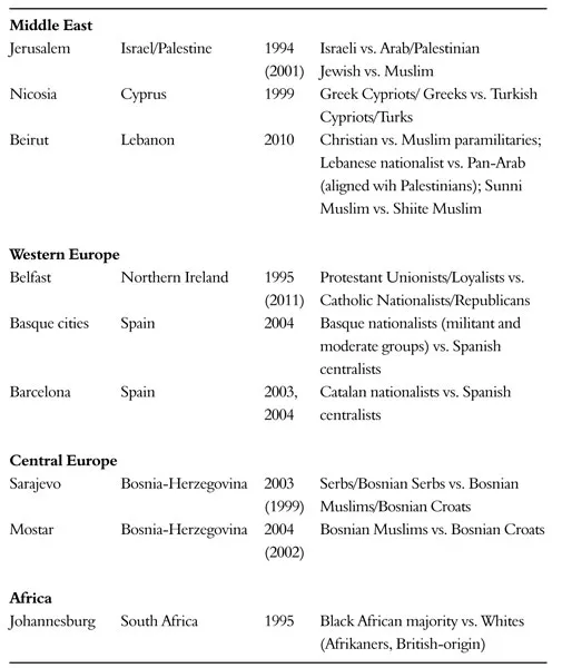 Each of the nine primary cities that I will examine (see table 1) has been, or currently is, challenged by deep and challenging questions arising from historic and contemporary inter-group conflict, and has been at one time or another part of political negotiations aimed at transitioning the city and society towards a more mutually co-existent future. The common ground upon which these nine cities stand is defined by urbanism, inter-group difference, and political transition. I selected the first three cases – Belfast, Jerusalem, and Johannesburg – in order to compare a city with unresolved political tensions (Belfast in 1995), a city amidst a political settlement (post-1993 Oslo Jerusalem), and a city amidst a successful political transition (post-apartheid Johannesburg). My study of Nicosia came about due to fortune, because I was invited to a negotiation forum there and made inside contacts. I chose the second set of case studies to focus on cities amidst transition – after a war in the case of Sarajevo and Mostar (Bosnia), and after the 1970s transition from Franco authoritarianism in the case of Spanish cities. The Spanish transition coming 20 years prior to the Bosnian one was an intentional feature of case study selection. I also focused on the Spanish cases because many observers view the Franco-to-democracy transition in Spain as effective and I wanted to explore this possibly more advanced case of inter-group co-existence.