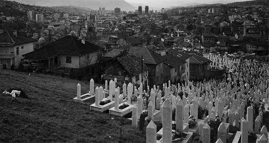 The ‘urbicidal’ siege of Sarajevo by Bosnian Serb and Serbian militias that completely blockaded and encircled the city lasted 1,395 days (from 2 May 1992 to 26 February 1996), killed 11,000 civilians, including 1,600 children, and damaged or destroyed 60 per cent of the city’s buildings. In my visit to the city in 2003, 8 years after the war, the political ‘solution’ and the ‘peace’ still had an imposed feeling. The Dayton accord of 1995 institutionalized a de facto partition of Bosnia-Herzegovina. The autonomous Bosnian Serb entity of Republika Srpska created by Dayton comprises 49 per cent of the country’s territory and lies immediately to the east of the city, a reward for its ruthless fighting machine. The city is now of markedly less ethnic diversity than before the war. The ‘peace’ in Sarajevo approximated what one finds when visiting a cemetery.