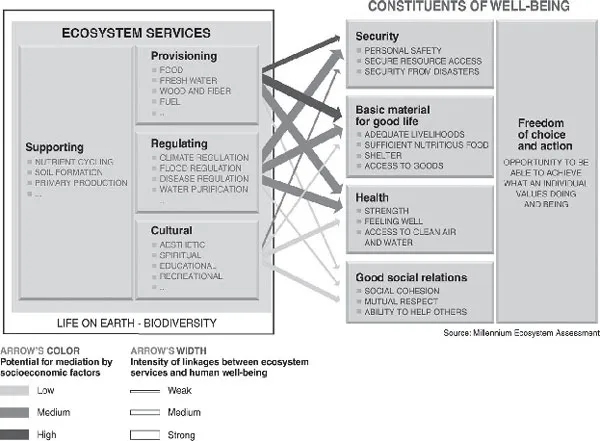 Figure 1.1 indicates how ecosystem services are seen as intimately tied to human well-being within the MEA framework. Human well-being is broadly conceived to have multiple components, including not only the material conditions required for sustained livelihoods such as food and shelter, and for a healthy life such as clean air and water. Well-being also attends to good social relations such as social cohesion and human security, the latter includes protection from natural and human-made disasters among other threats to human security. Additionally, the concept comprises freedom of choice and action, which is understood to be influenced by other components of well-being and constitutes a precondition for achieving other aspects of well-being.
