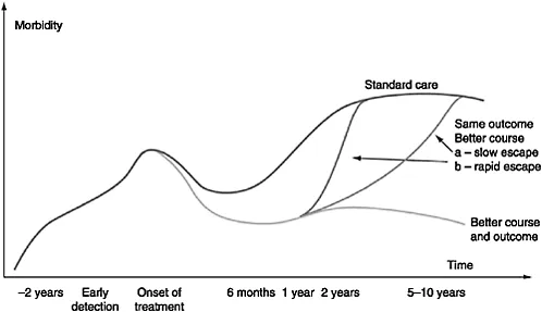 Early intervention means early detection of new cases, shortening delays in effective treatment, and providing optimal and sustained treatment in the early ācritical periodā of the first few years of illness (Malla and Norman 2002). Even on the basis of our existing knowledge, substantial reductions in prevalence and improved quality of life are possible for patients, provided societies are prepared to pay for it. However, this has not occurred, despite the development of effective treatments (Hegarty et al. 1994; Jablensky et al. 1999), because we have so far failed to translate these advances to the real world beyond the randomised controlled trial. Early intervention, with its promise of more efficient treatment through an enhanced focus on the early phases of illness, is an additional prevalence and burden reduction strategy, which is now available to be widely tested and, if cost-effective, to be widely implemented. This is hardly a radical goal and would be non-controversial in other areas of healthcare where primary prevention remains out of reach (for example, diabetes and many cancers).