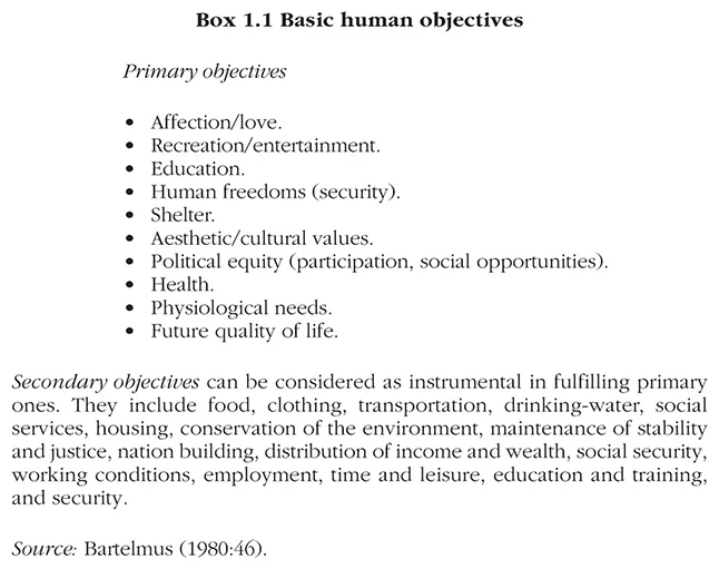 Quantifiable definitions of these concepts are needed for measuring progress towards development goals. A typical starting point has been to break down the overall objective of human welfare into sub-objectives or targets. The difficulties involved are described by Bartelmus (1980:40 et seq.). Box 1.1 offers a tentative list of general (primary) human objectives, condensed from a variety of publicly proclaimed social objectives. Subjective