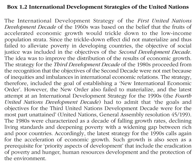As indicated in Box 1.2, this stark picture of development seems to have brought back a focus on economic growth, the central theme of the First International Development Strategy in the 1960s. The Fourth Strategy for the 1990s advocates the revitalization of economic growth while paying some attention to other âaspectsâ of development. To some extent, this return to economic growth strategies might have been brought about by the absence of a widely accepted indicator of development. The