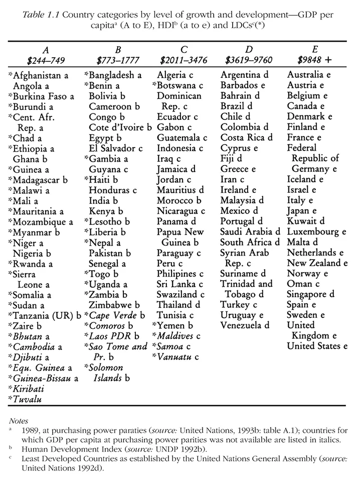 Nations 1993b). Countries are grouped into five categories from A for the poorest and E for the richest countries. This ranking by economic growth is contrasted with a broader development measure, the Human Development Index (HDI), developed by the United Nations Development Programme (UNDP 1992b). The Index combines indicators of national income, life expectancy and educational attainment. It reflects, therefore, a relatively arbitrary selection of factors considered to contribute âsignificantlyâ to development. A more politically determined categorization of Least Developed Countries (LDCs) is established by the General Assembly of the United Nations. LDCs are countries with low GDP per capita, a low level of the âphysical qualityâ of life (life expectancy, calorie supply, school enrolment and adult literacy) and lack of economic diversification. Those countries are indicated with an asterisk in Table 1.1.