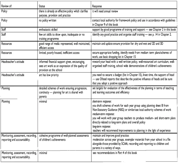 The above can form a checklist for you in the early days and will help to prioritise the demands upon your time. If the policy is well written and the schemes of work reflect those stated intentions then you may well turn your attention to planning, assessment, recording and resourcing. So having looked at the above list of evidence you can now evaluate each of the following major issues using the pragmatic headings of status and response.